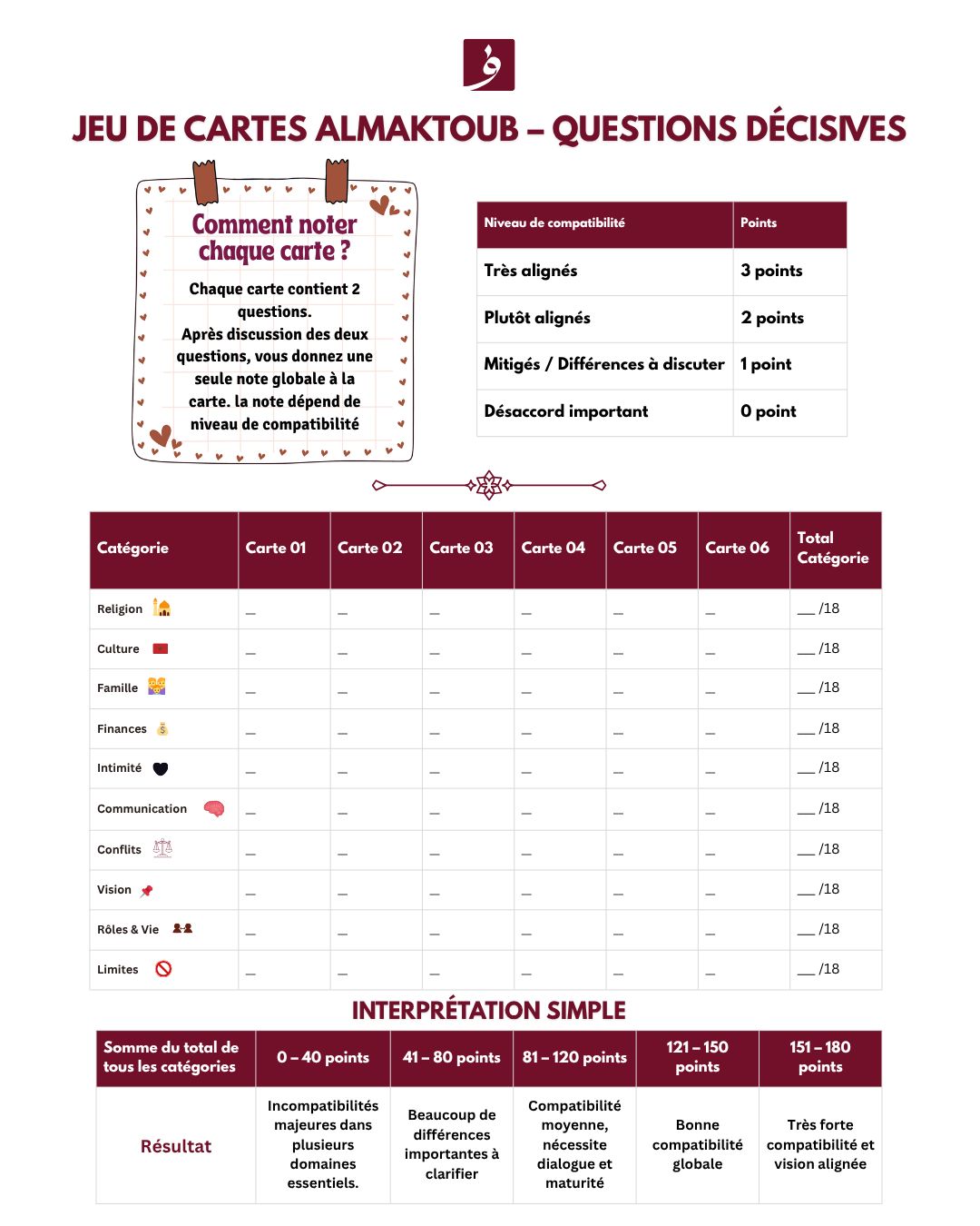 Le jeu est organisé en 10 catégories clés, chacune abordant un aspect essentiel de la relation : valeurs, religion, vision du mariage, communication, limites, confiance, famille, finances, intimité, objectifs de vie…