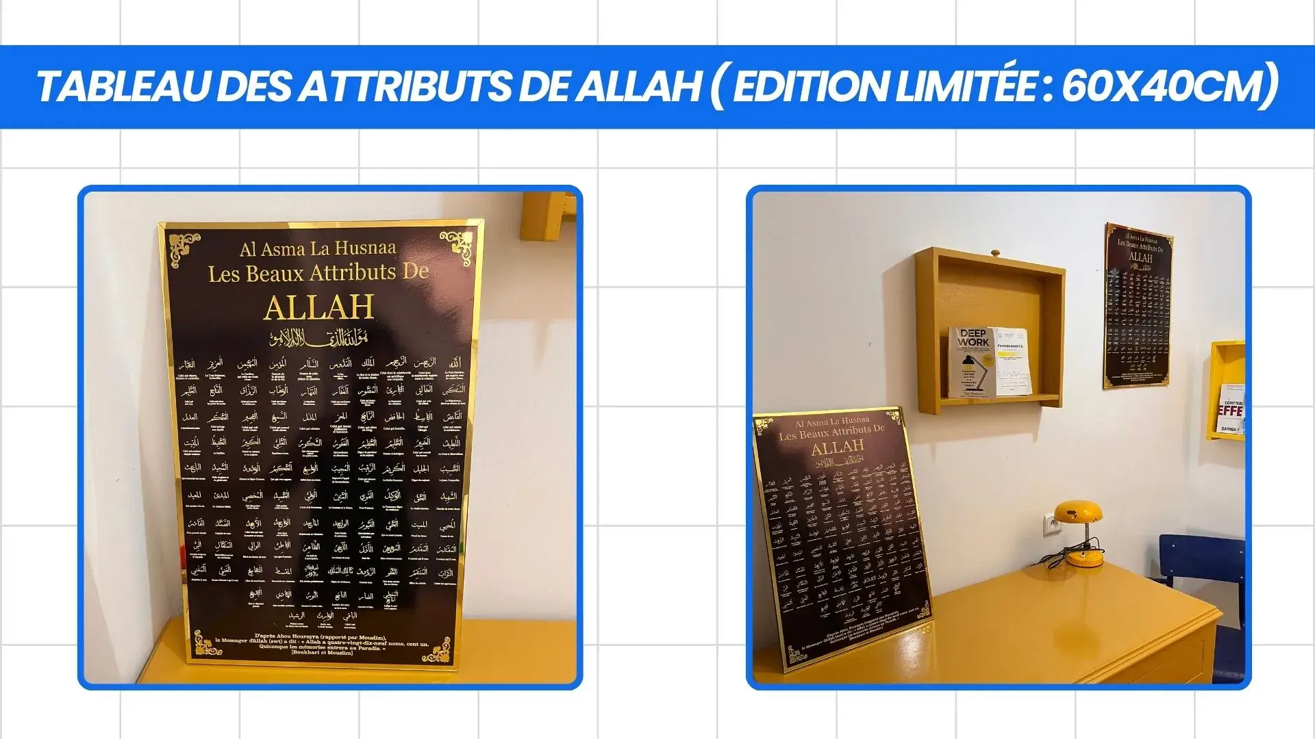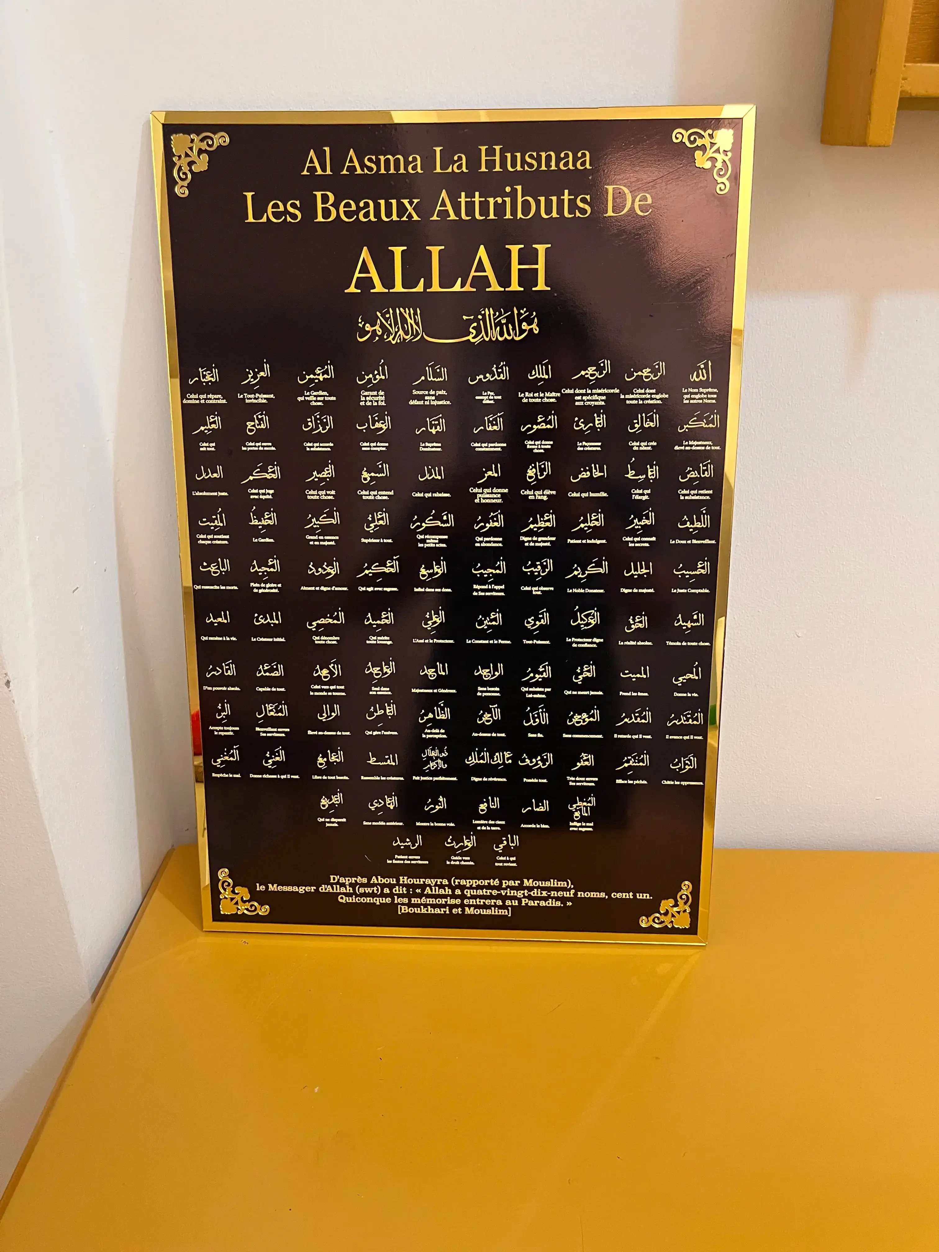 Plus qu’un simple objet décoratif, ce tableau est un outil précieux pour se rapprocher d’Allah. Il vous accompagne dans votre apprentissage des attributs divins et vous invite, chaque jour, à la méditation et à la reconnaissance. Offrez-le ou offrez-vous ce rappel constant de la grandeur et de la miséricorde de votre Créateur.
